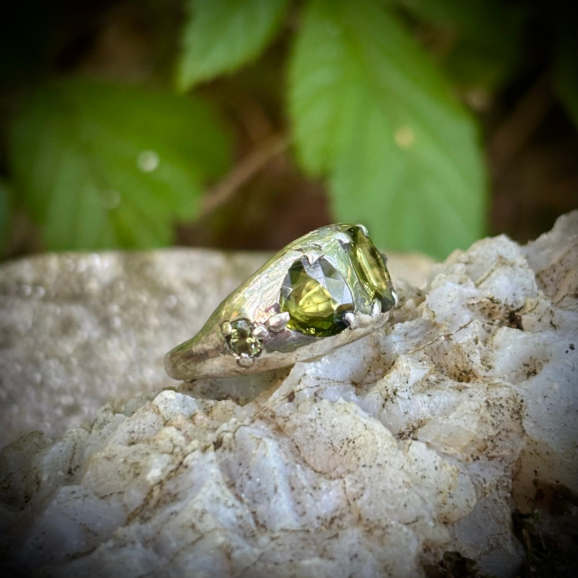 One of one; solid sterling silver, set with four spring green natural Aussie sapphires. Size 8.