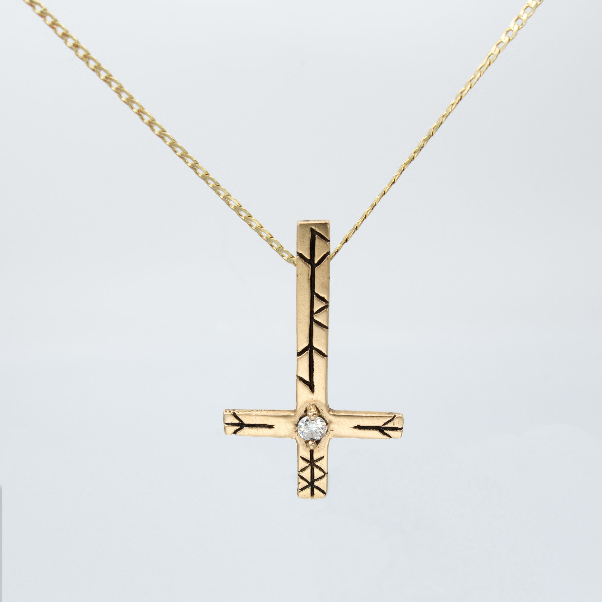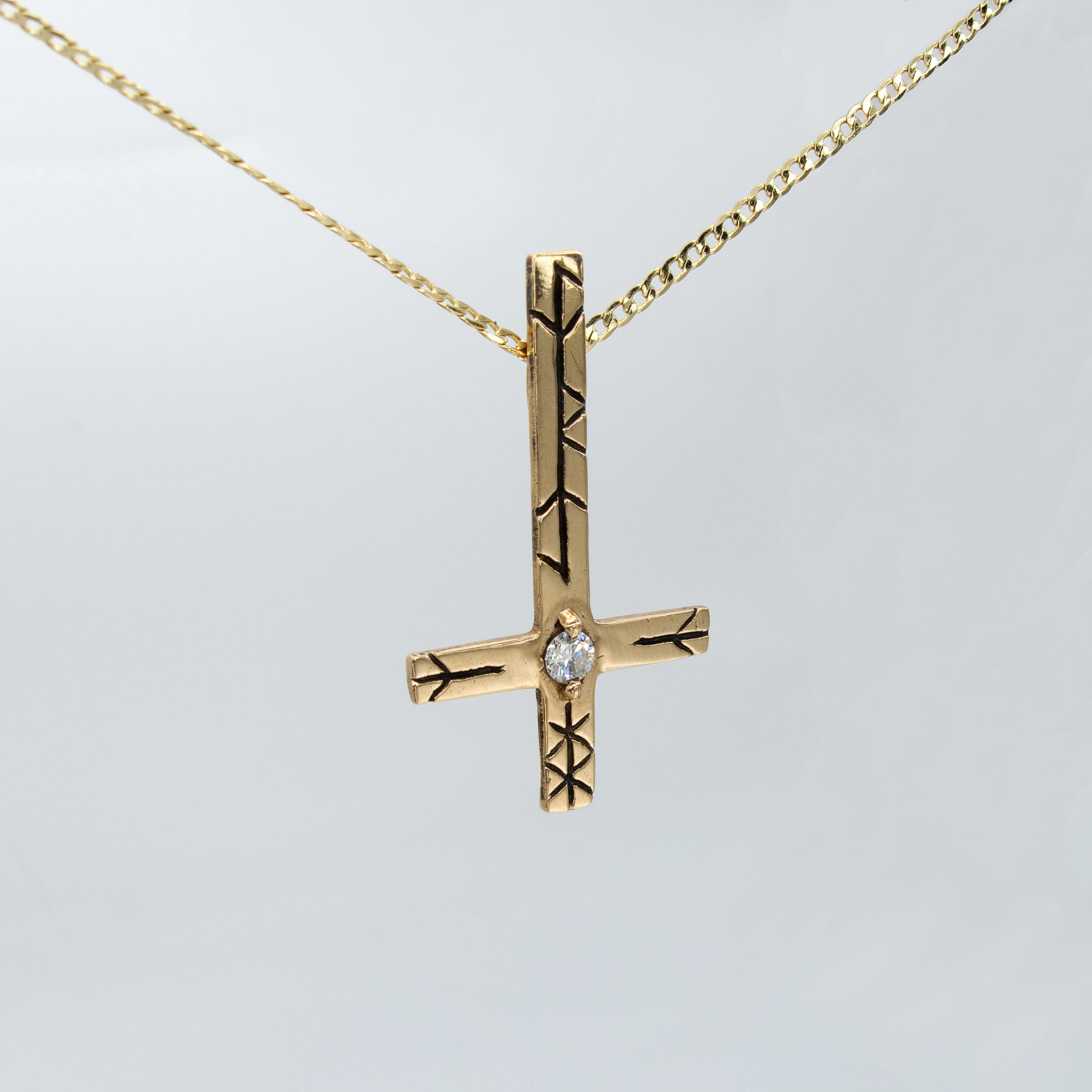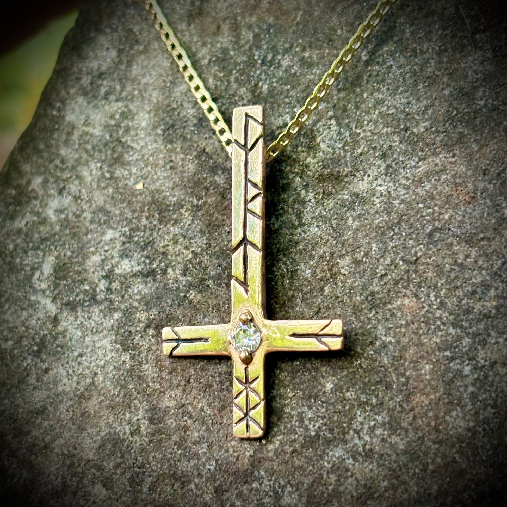14k gold set with a colorless round brilliant moissanite. Pendant is roughly 2” long and comes with a solid 14k gold 18” chain.