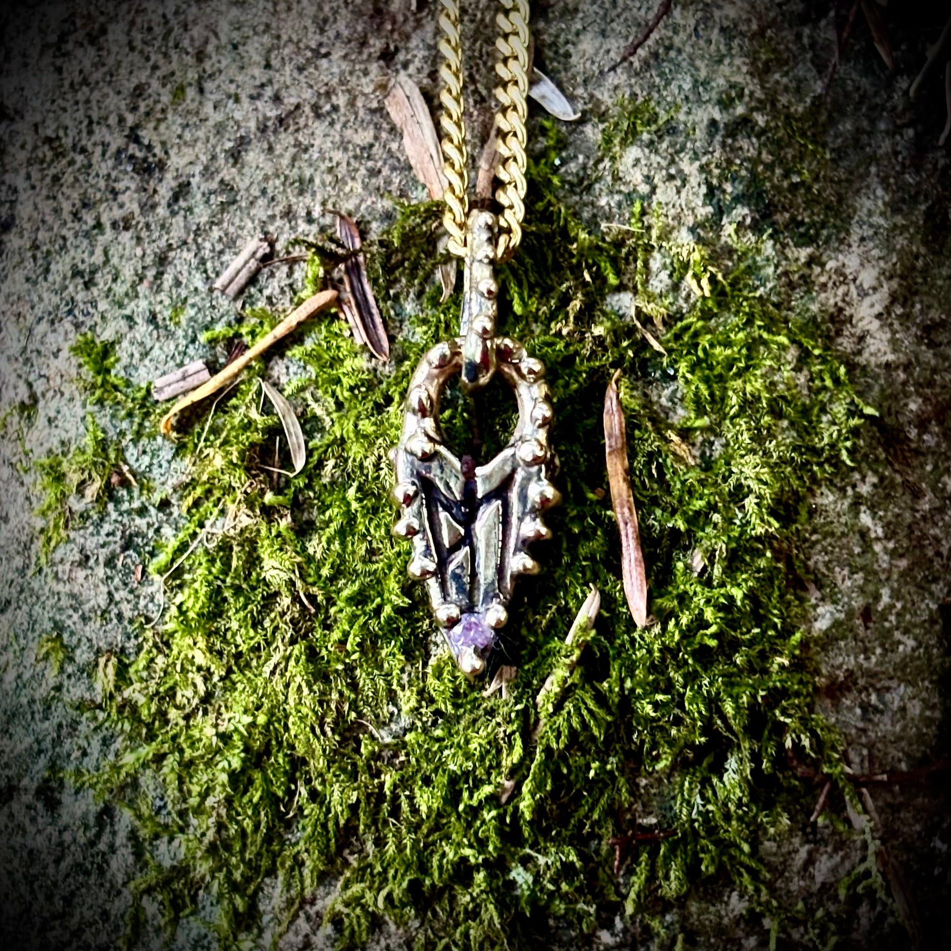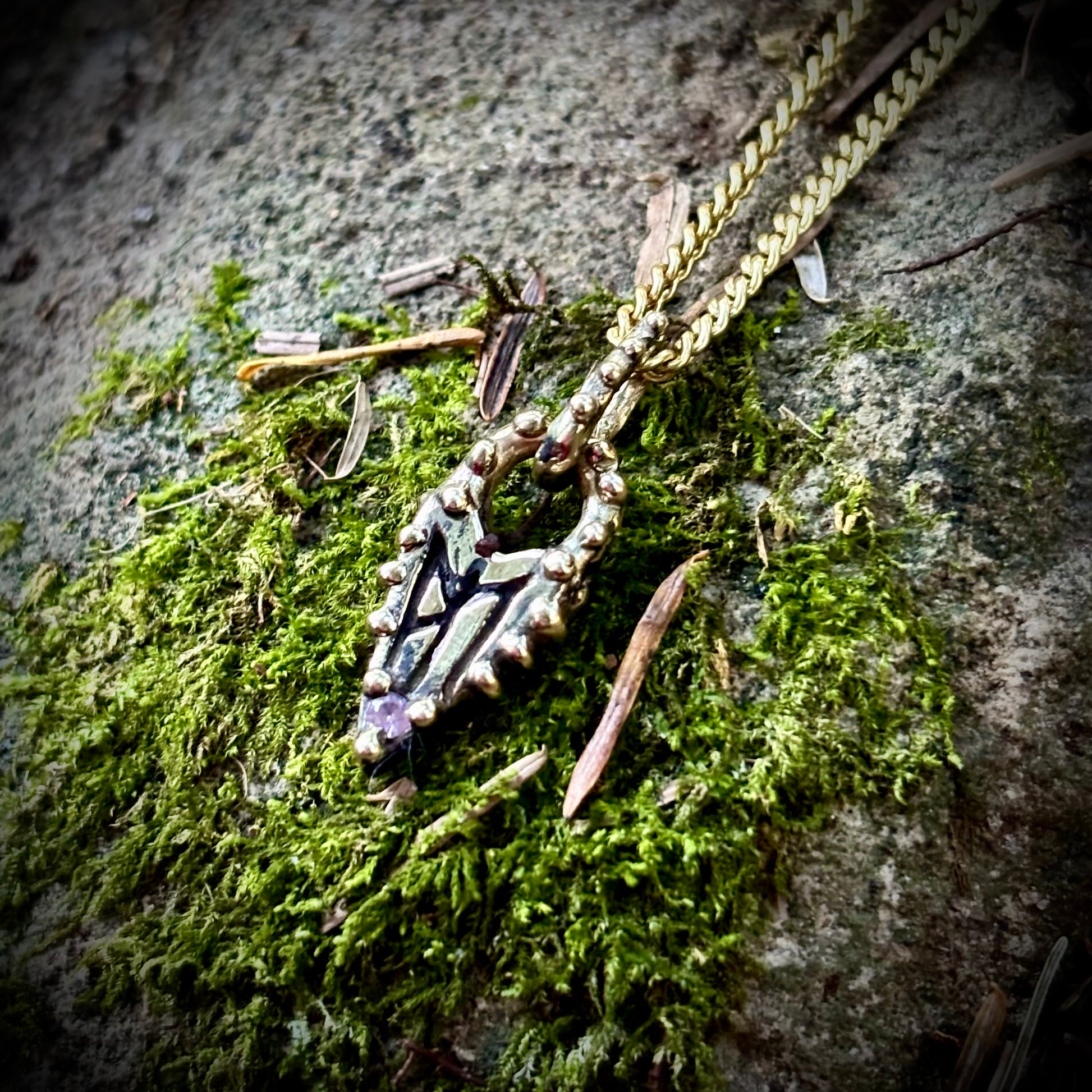 A little love heart, etched with a bind rune for self love, made fancy with granulation and set with a wee powder pink sapphire. Comes on a 14k gold filled curb chain.