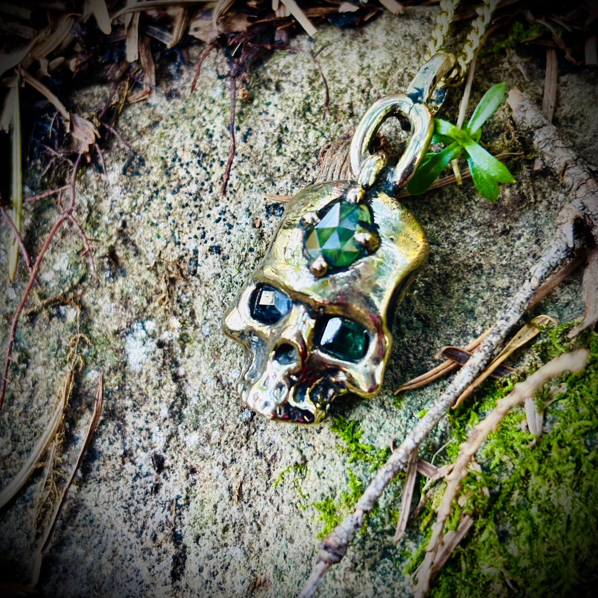 A bold golden skull, carved in bronze and set with three choice Australian sapphires in shades of oceanic greens and blues. Chain link detail at the bail; comes on a 14k gold filled curb chain.