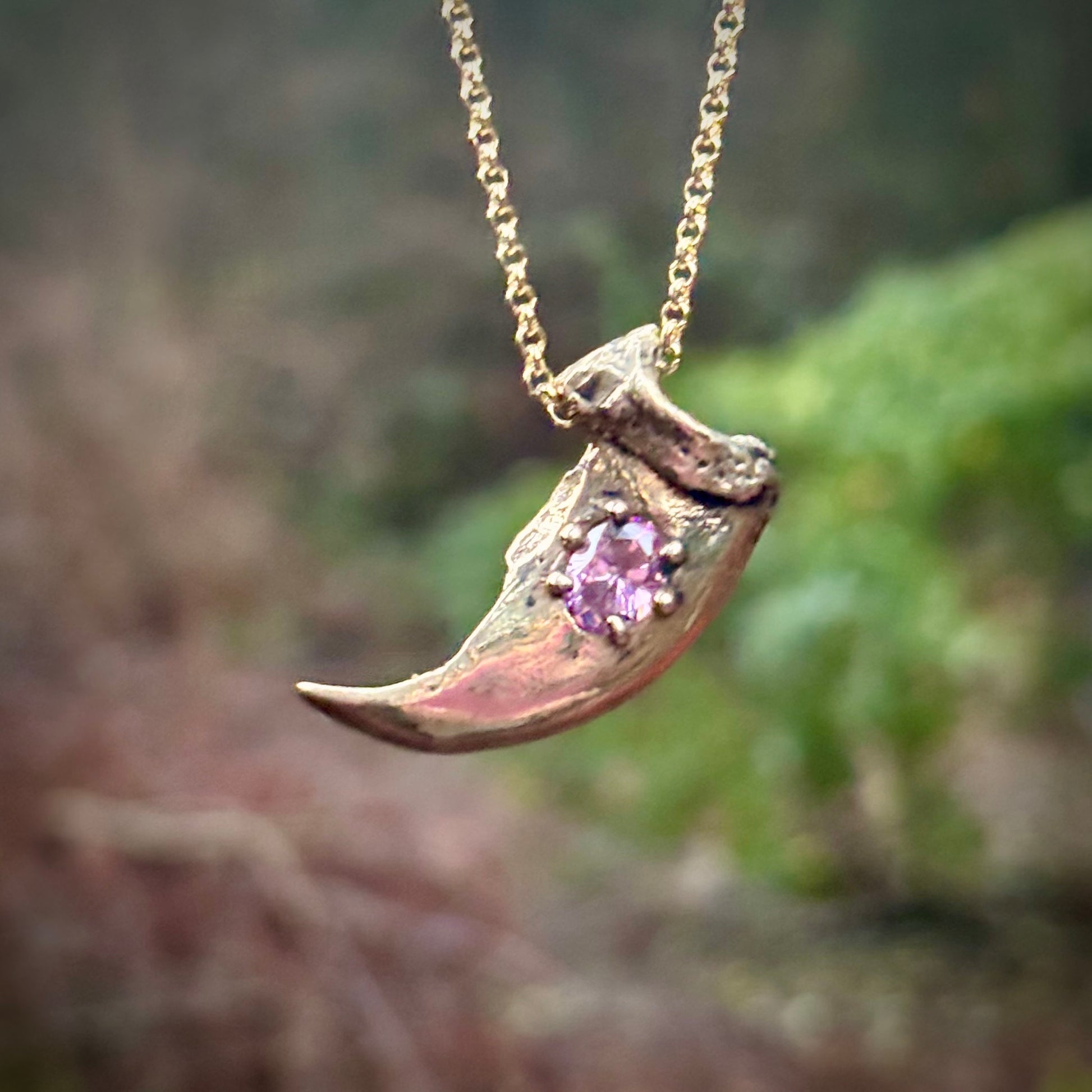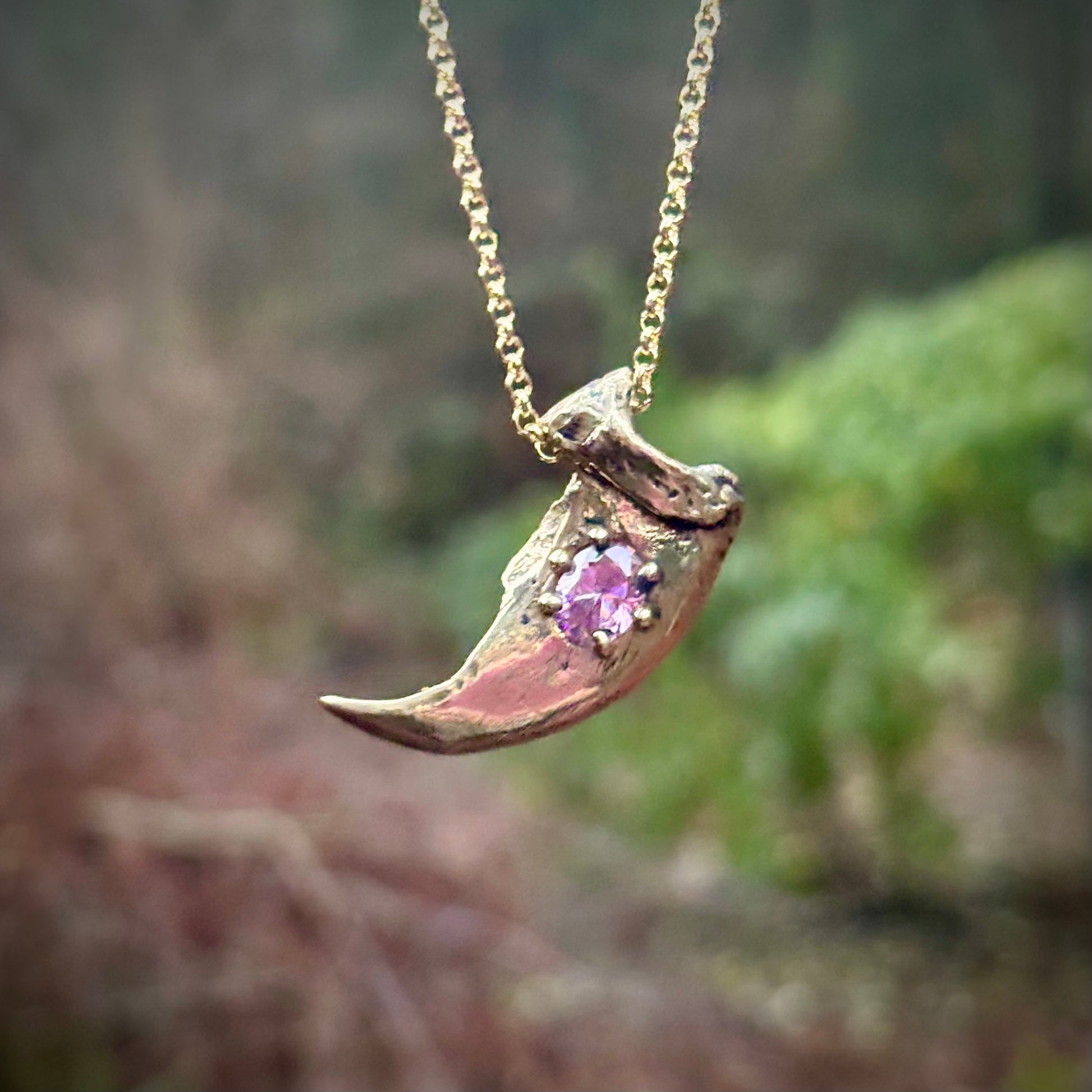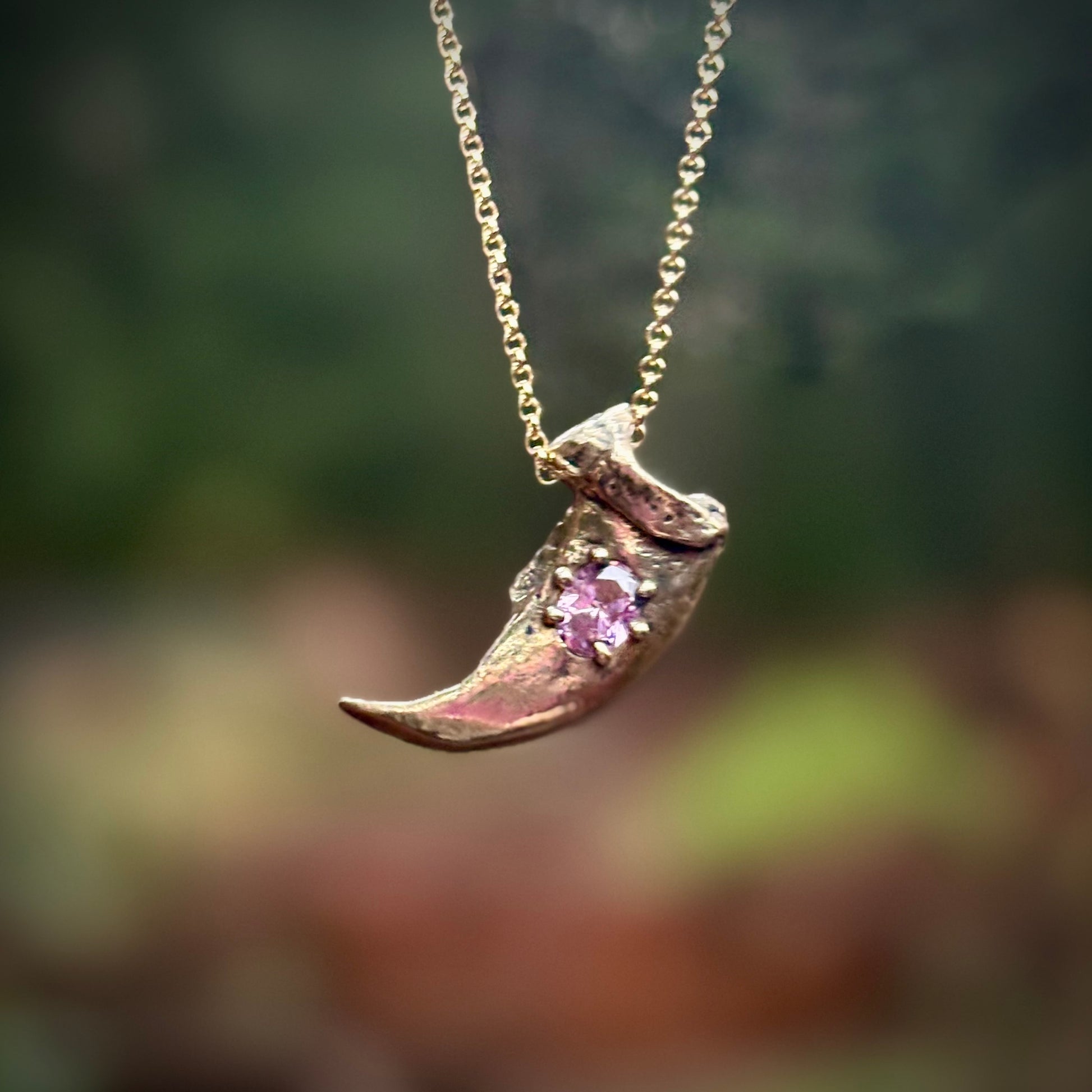 A casting of the claw from Ursus Americanus, the wonderful North American black bear, in golden jeweler's brass and set with a pink lab sapphire. Comes on a blackened sterling chain
