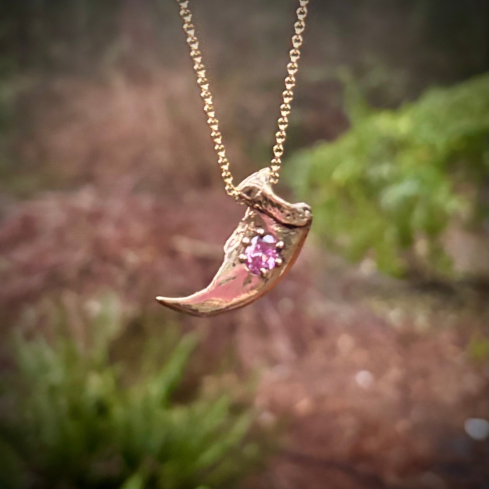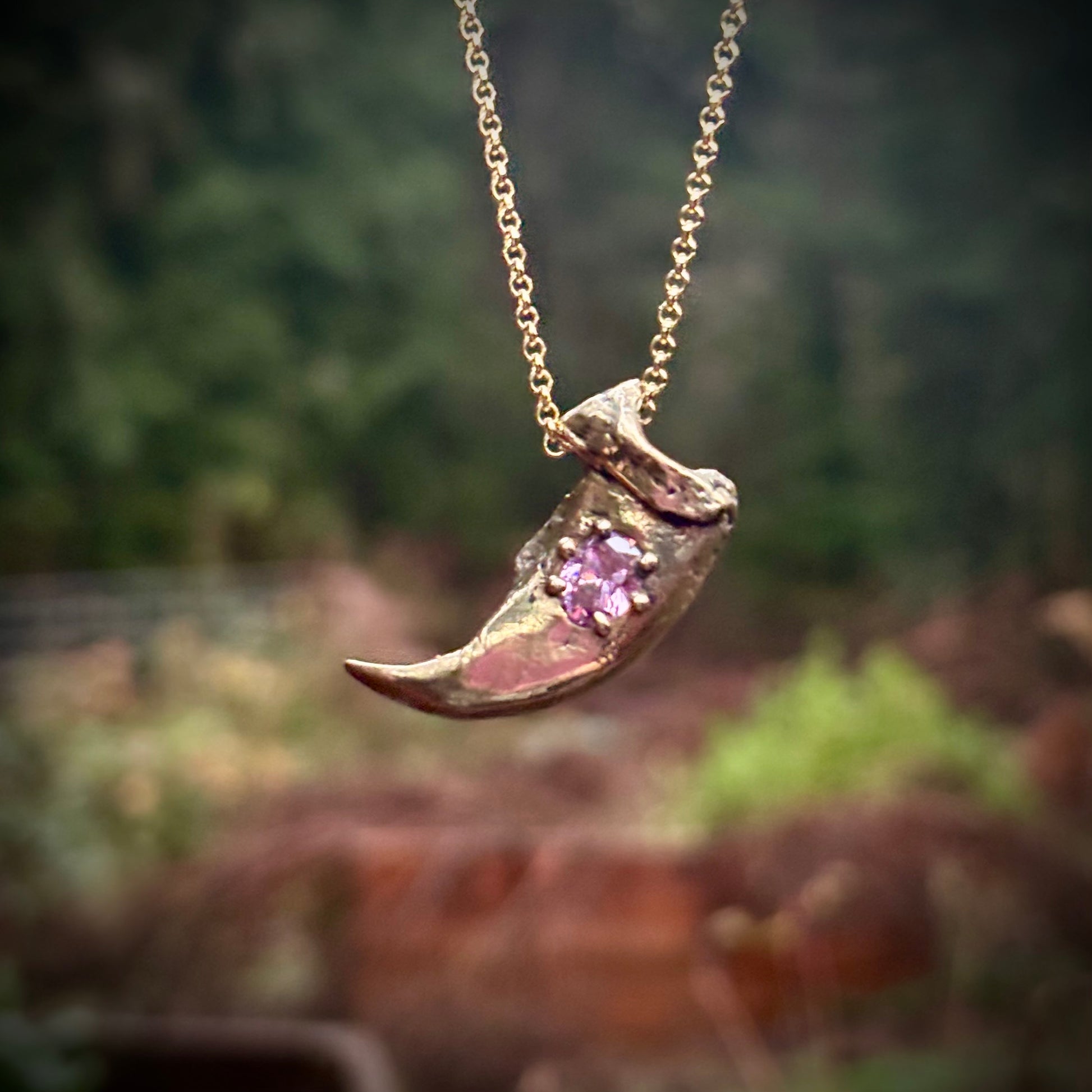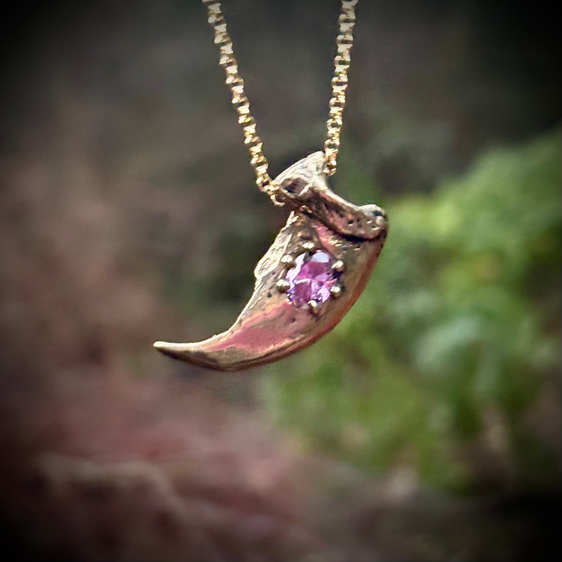A casting of the claw from Ursus Americanus, the wonderful North American black bear, in golden jeweler's brass and set with a pink lab sapphire. Comes on a blackened sterling chain