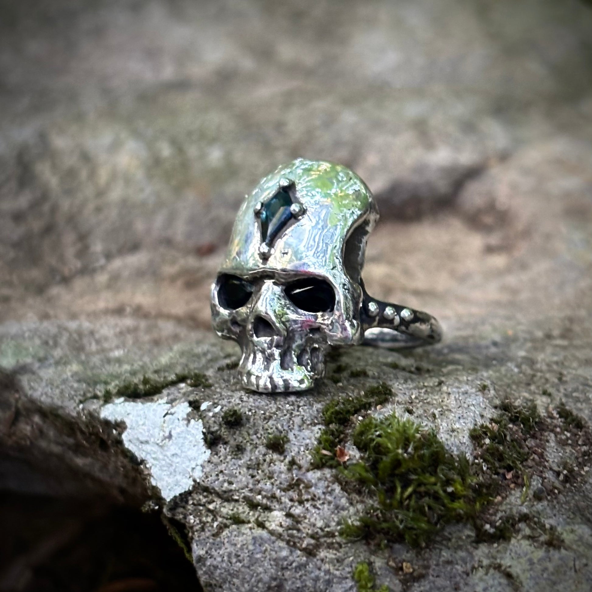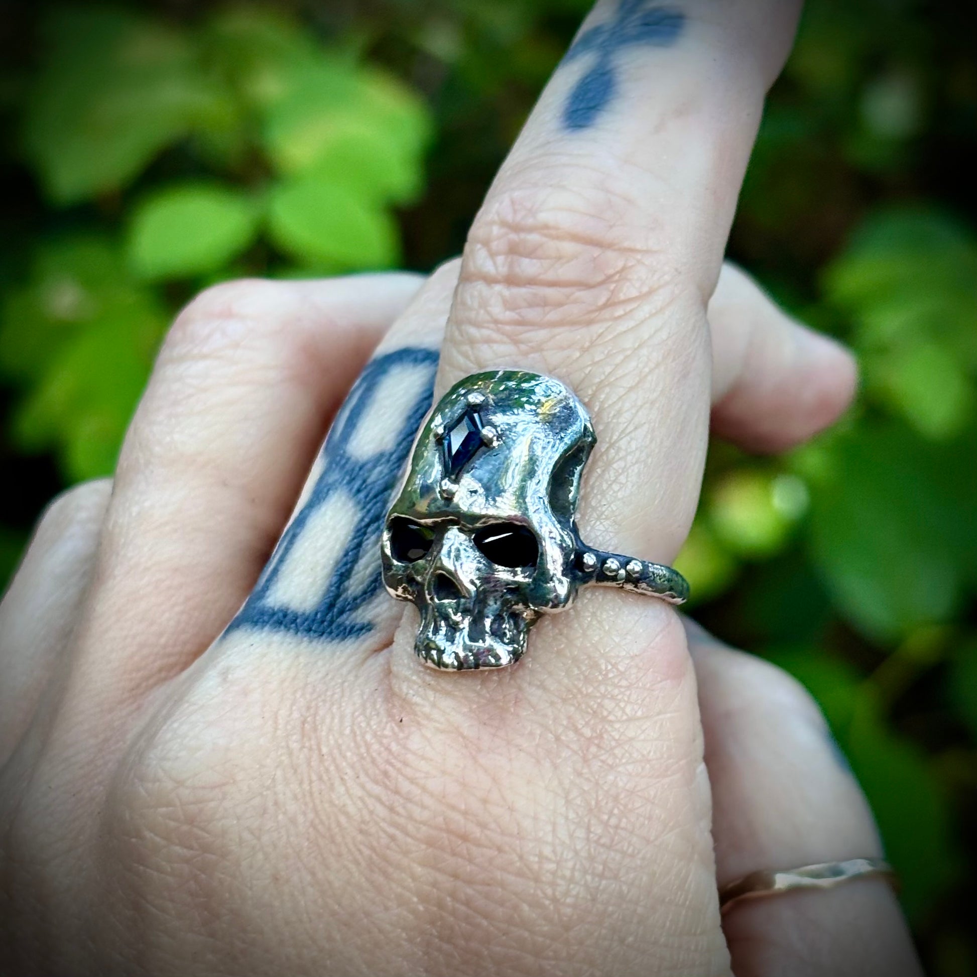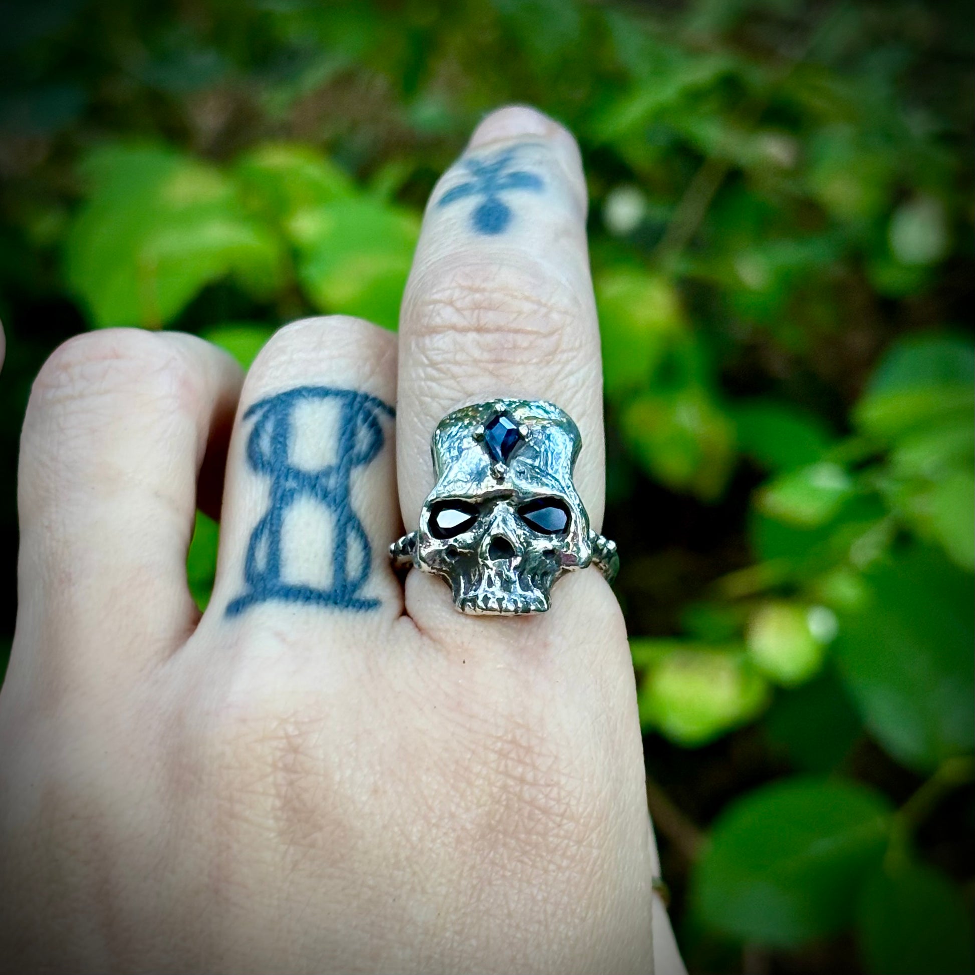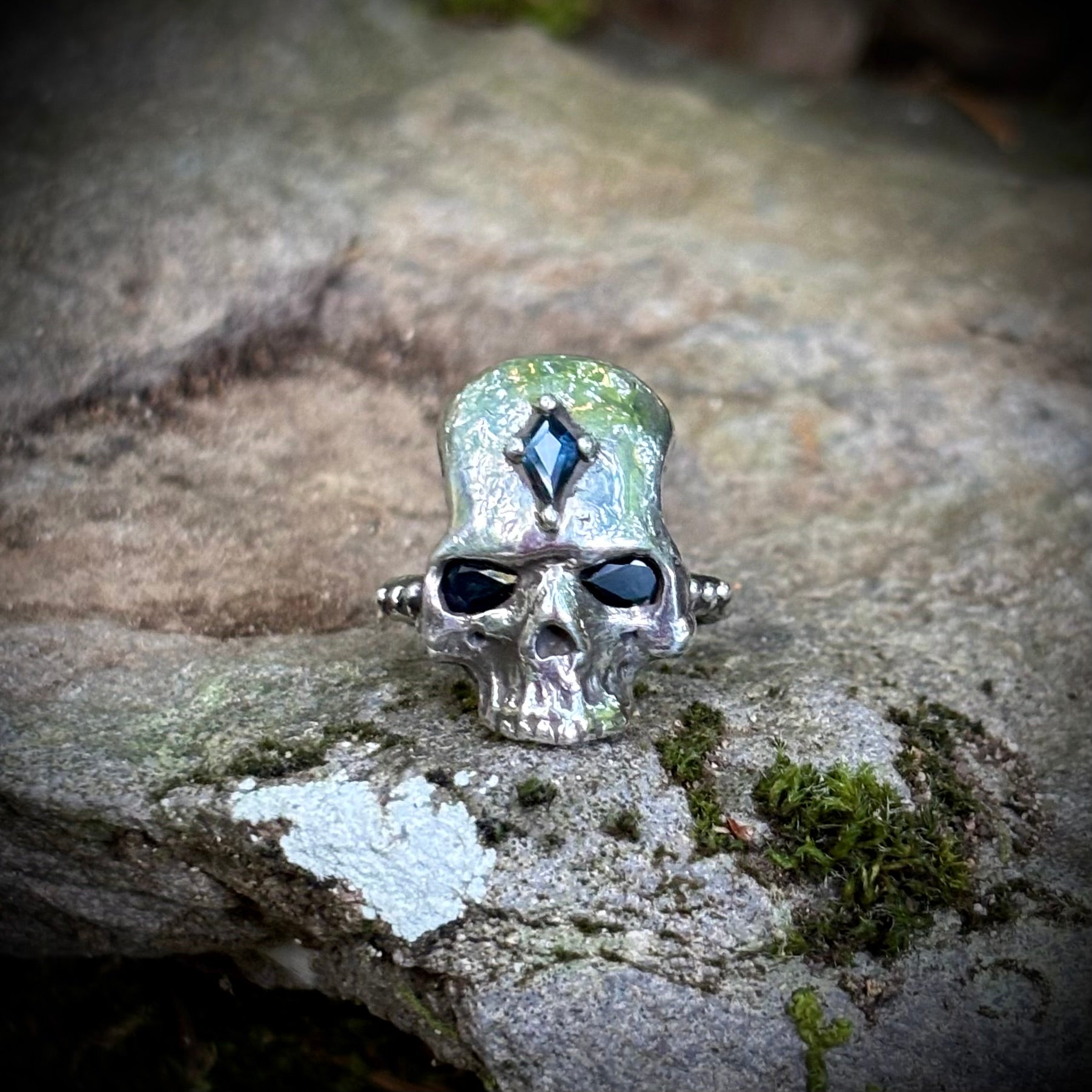 The classic skull ring, perfectly scaled to face up bold and be worn in total comfort. It'll become part of your hand. Hand carved in sterling silver and set with deep ocean blue Australian sapphires, with a gorgeous blue kite set in the forehead. Size 8.