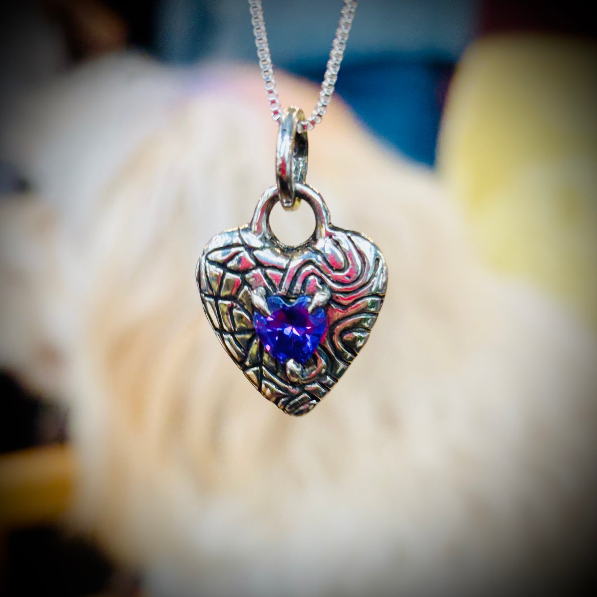 The one and only love heart made just for this V day…can’t lie, it’s my favorite holiday! This sterling silver pendant was cast as one piece, including the articulated bail. Half the face is carved with curving lines, and the other with a web, representing the complex nature of love in all its confusing, beautiful forms. A vibrant violet sapphire heart is the centerpiece, emanating light. Comes on a sterling 18” box chain.