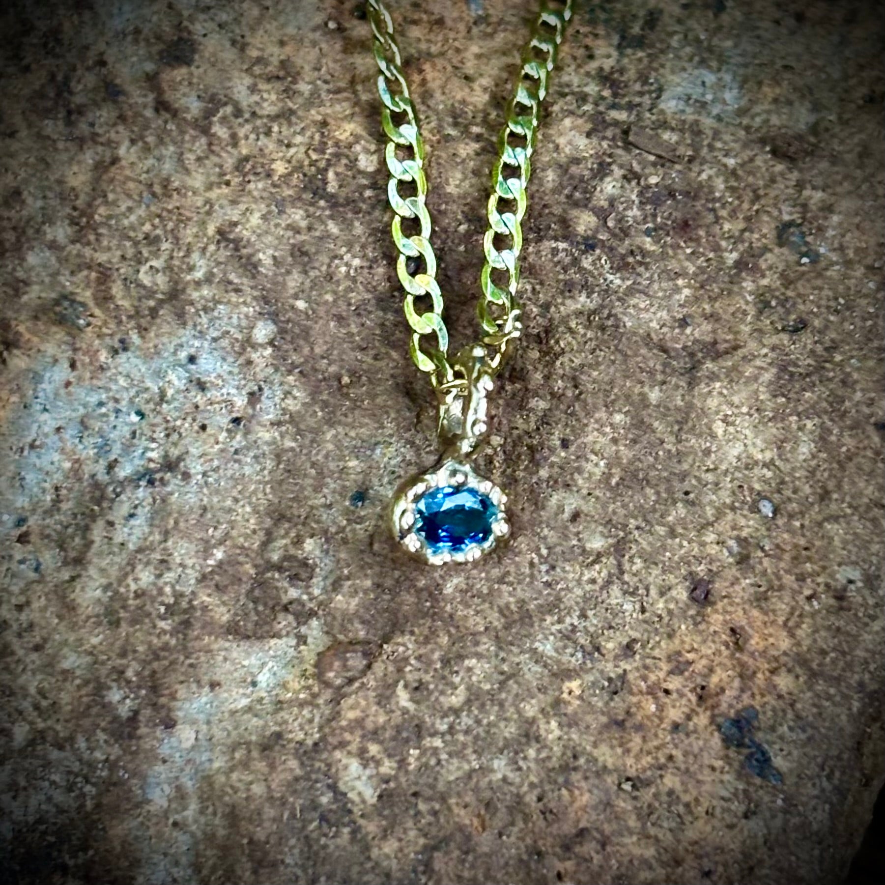The next installment of the neo-Etruscan collection is these sweet 10k gold babies! The solid gold looks rich and the stones have been chosen for their vibrancy. This one is a greenish blue brilliant Australian mined sapphire, and she shines. Comes on a fancy, high quality 18” gold fill chain.